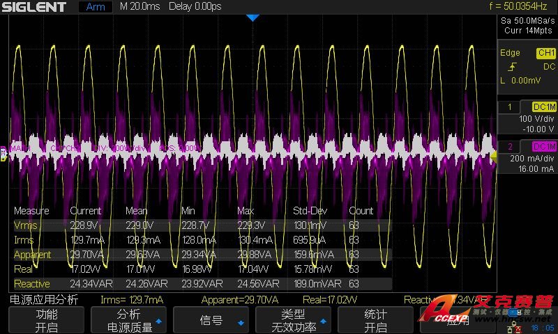 為驗(yàn)證負(fù)載的實(shí)際功率。我們把SDM3065X作為電流表接入到負(fù)載電路中,如圖6所示;同時(shí)把高壓差分探頭和電流探頭接入到負(fù)載電路中。在功率分析中,選擇電壓均方根、電流均方根、有效功率。結(jié)果如圖7所示: