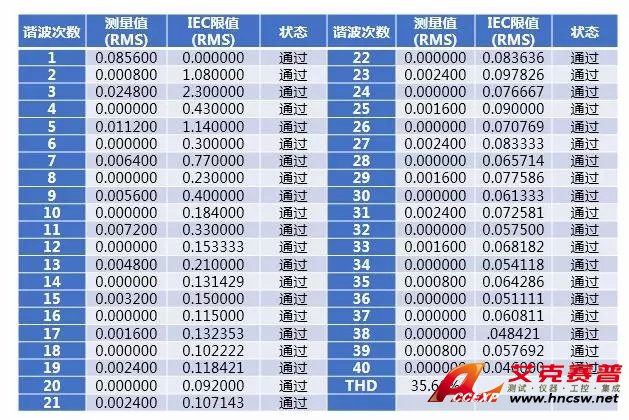 從表中可以了解到所測(cè)的電流諧波均滿足IEC61000-3-2標(biāo)準(zhǔn)限值。