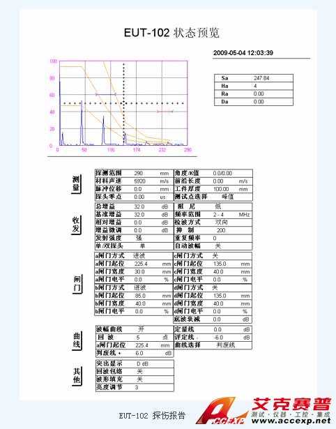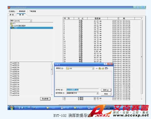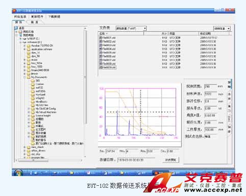 EUT102能通過網絡或U盤將探傷文件和測厚文件上傳置PC,并利用“EUT102數(shù)據傳送系統(tǒng)”軟件打開并重建探傷回波波型,羅列測厚數(shù)據,并可以將數(shù)據導出到EXCEL,方便用戶生成探傷和測厚報告。